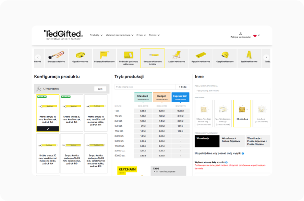 Skorzystaj z konfiguratora online TedGifted i zaprojektuj własną smycz do kluczy z nadrukiem . Wybierz wariant materiałowy – Classic, Eco lub Reflect, dobierz niezbędne akcesoria i załącz swoje logo, aby w kilka chwil zobaczyć gotową wizualizację.
